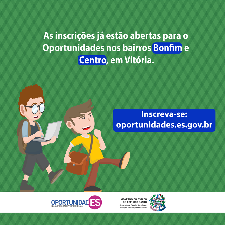 O projeto OportunidadES está com 1.180 vagas abertas para os moradores de Bonfim e Centro, em Vitória, e Nova Bethânia e Soteco, em Viana. Ao todo, 39 cursos de diferentes áreas profissionais, sendo um curso novo, estão disponíveis para escolha dos moradores. As inscrições em Viana terminam no domingo (20) e em Vitória na segunda (21). O interessado deve se inscrever no site do projeto: www.oportunidades.es.gov.br.