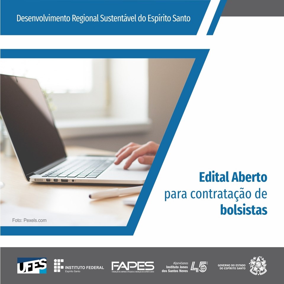O Instituto Jones dos Santos Neves (IJSN) abriu edital para contratação de bolsistas que irão atuar no projeto de pesquisa “Desenvolvimento Regional Sustentável do Espírito Santo”. São duas vagas, além de cadastro de reserva, para profissionais de Nível Superior. As inscrições estão abertas e podem ser realizadas até a próxima terça-feira (14), mediante o preenchimento da ficha de inscrição online (disponibilizada neste link) e envio da documentação comprobatória descrita no edital (Veja a íntegra aqui).