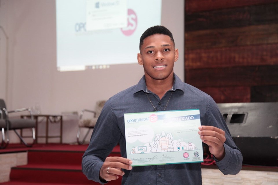 Depois de mais de um mês de aulas, os alunos de Consolação, em Vitória, e São Torquato, em Vila Velha, participaram da cerimônia de formatura realizada gratuitamente pelo projeto OportunidadES. Um dos formandos de Consolação foi Filipe Fabiano Machado, de 21 anos, que recebeu o certificado com o sentimento de dever cumprido.