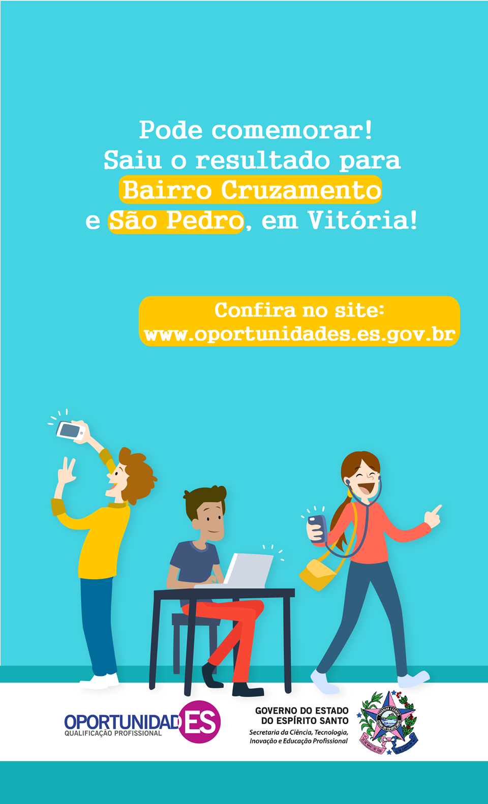 Atenção, Vitória! O OportunidadES divulgou a lista com os aprovados nos bairros Cruzamento e São Pedro. Os moradores dos bairros que se inscreveram em um dos cursos oferecidos gratuitamente pelo projeto já podem conferir se estão classificados ou suplentes na lista no site www.oportunidades.es.gov.br, ou nos links abaixo: