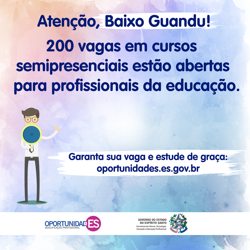 A secretaria de Estado da Ciência, Tecnologia, Inovação e Educação Profissional (Secti), por meio do projeto OportunidadES, está com 200 vagas abertas para cursos semipresenciais pela primeira vez no interior do Estado. Os profissionais da educação de Baixo Guandu já podem se inscrever em um dos dois cursos de Formação Inicial Continuada (FIC) do projeto.