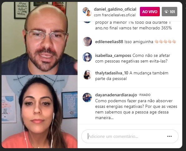 Nessa terça-feira (23), aconteceu a segunda Live do Conhecimento que debateu o tema “Como obter sucesso praticando a disciplina todos os dias”, com os masters Coaches Daniel Galdino e Francielle Alves, que também é mentora especializada em Saúde e Bem-Estar. Cada live reuniu cerca de 100 espectadores, que participaram de forma ativa, enviando perguntas e comentando sobre os debates.