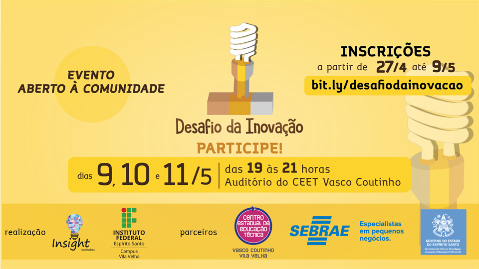 A Insight Incubadora promove junto com o Núcleo Incubador IFES - Campus de Vila Velha, em parceria com o SEBRAE e o Governo do Estado do Espírito Santo, através da Secretaria de Estado de Ciência, Tecnologia, Inovação e Educação Profissional, o evento: