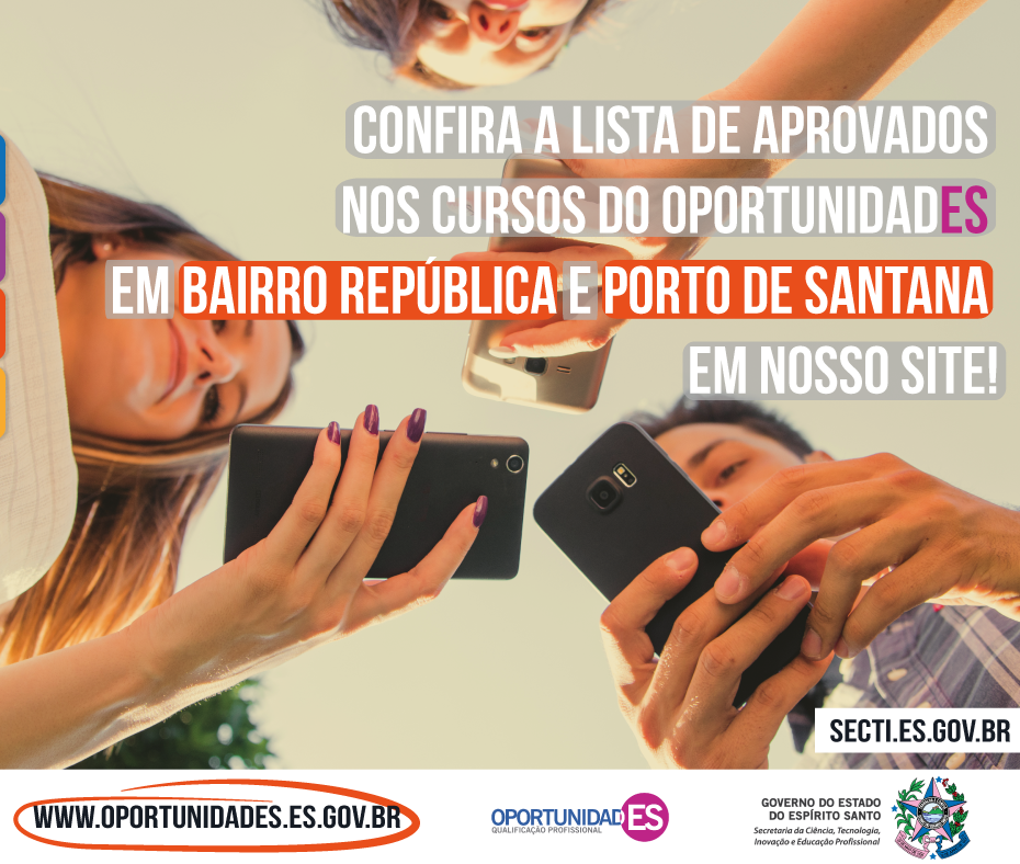 Os interessados em participar dos cursos ofertados pelo Projeto OportunidadES em Bairro República, Vitória, e Porto de Santana, Cariacica, podem comemorar. As listas com os classificados e suplentes nos cursos de qualificação profissional presenciais gratuitos do projeto já estão disponíveis para acesso no site (www.oportunidades.es.gov.br) ou clicando nos links abaixo: