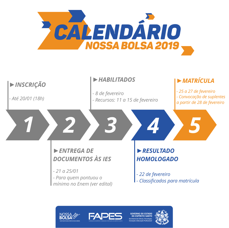 O processo seletivo do Programa Nossa Bolsa para 2019 está chegando ao fim. Nesta sexta-feira (22), a Fundação de Amparo à Pesquisa e Inovação do Espírito Santo (Fapes) divulga o resultado homologado, após o julgamento dos recursos interpostos na última semana. A matrícula dos selecionados deve ser realizada na própria faculdade de segunda (25) a quarta-feira (27).
