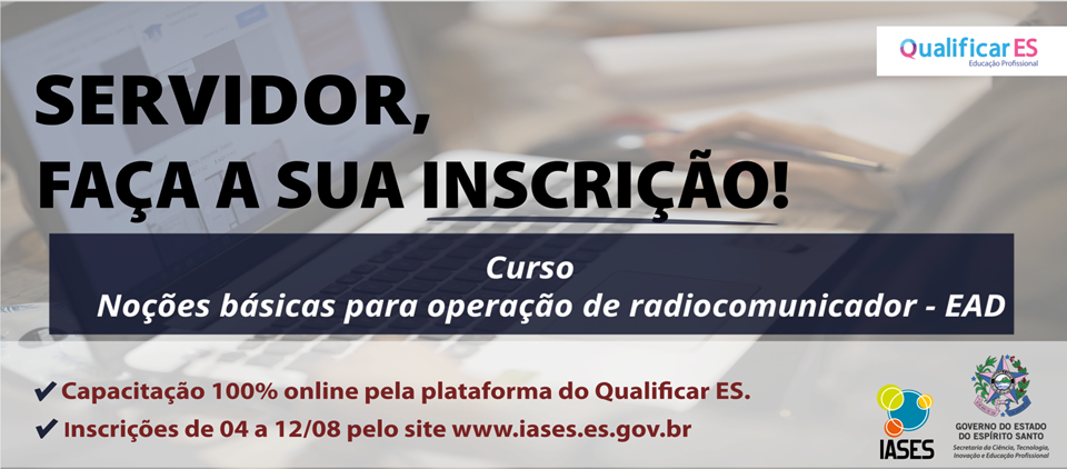 A partir desta terça-feira (04) até o dia 12 de agosto, estarão abertas as inscrições para o curso “Noções Básicas para Operação de Radiocomunicador - EAD”, ofertado na modalidade Educação a Distância (EaD), por meio do Programa Qualificar ES. São 300 vagas destinadas aos profissionais do Instituto de Atendimento Socioeducativo do Espírito Santo (Iases) e da Secretaria da Justiça (Sejus).