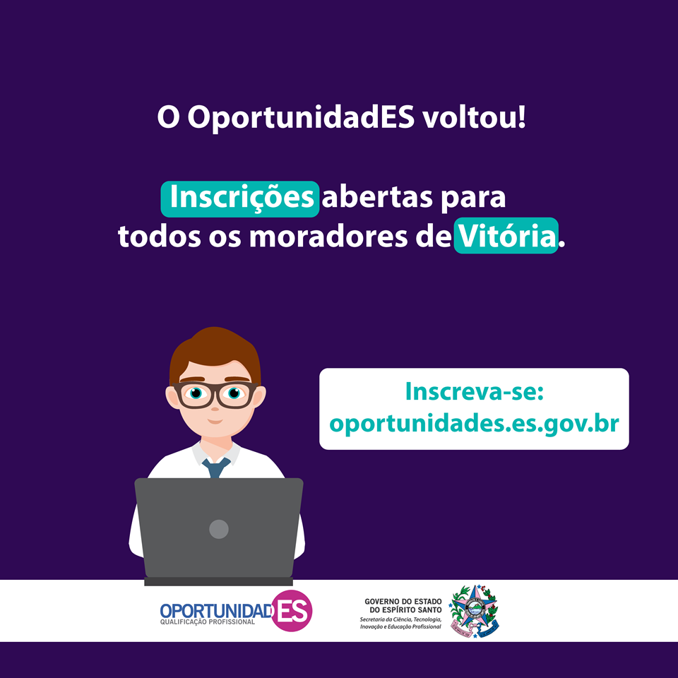 Também estão abertas 505 vagas para os moradores de Vila Velha. As chances são para 19 opções de cursos presenciais de qualificação profissional gratuitos. As inscrições terminam no domingo (15) e a lista com os aprovados será divulgada na próxima quinta-feira (19) no site do projeto. Para garantir uma vaga o candidato deve se inscrever no site do OportunidadES.