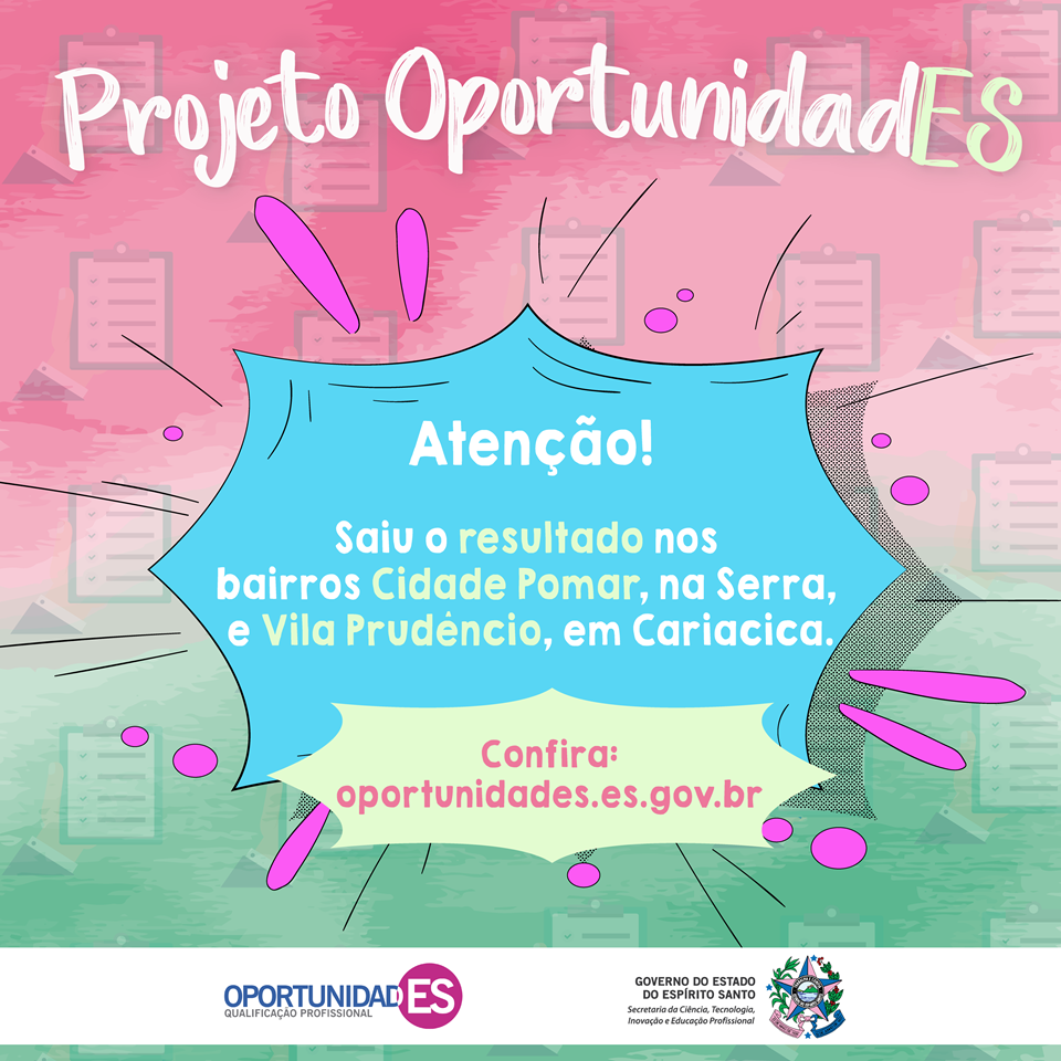 O Projeto OportunidadES é realizado pelo Governo do Estado, por meio da Secretaria da Ciência, Tecnologia, Inovação e Educação Profissional (Secti), e já ofereceu mais de 78 mil vagas em cursos de qualificação gratuitos em 2018.