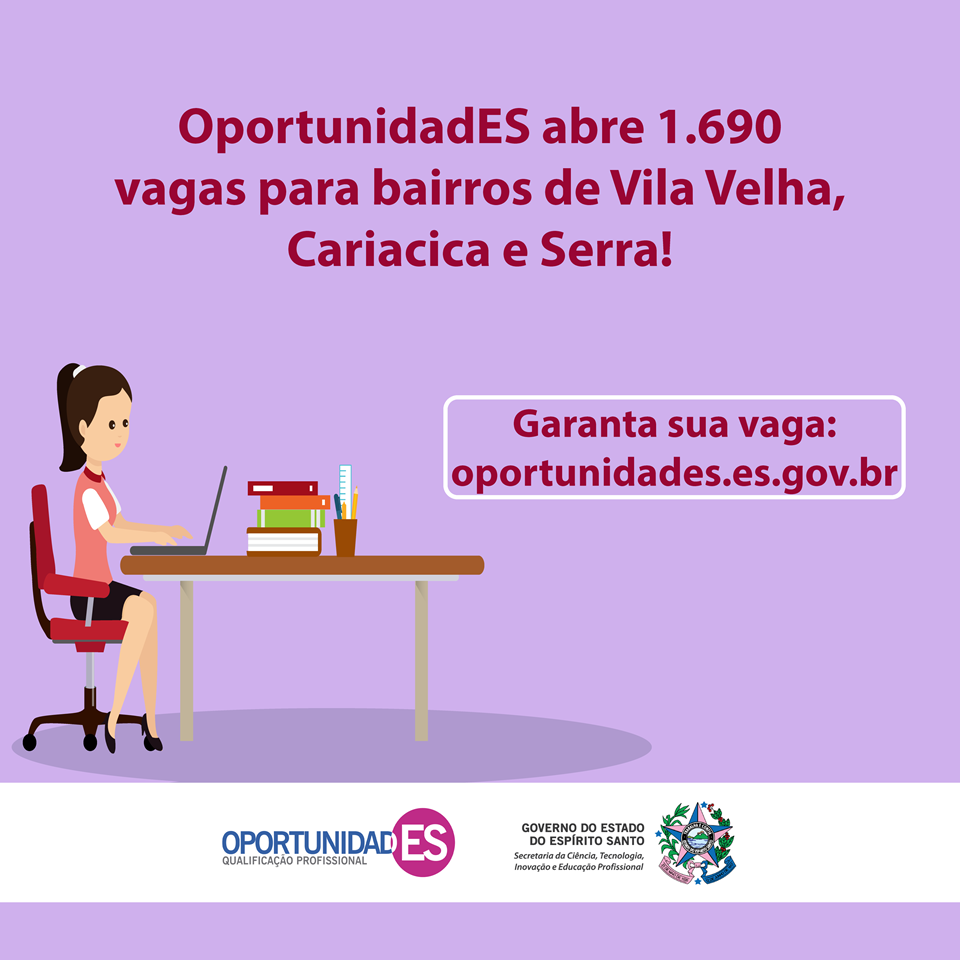 O Projeto OportunidadES continua com gás total e oferece mais 1.690 vagas para os moradores de: São Torquato e Ilha das Flores, em Vila Velha; Vila Palestina e Padre Gabriel, em Cariacica; e todos os bairros da Serra. Ao todo, 57 opções de cursos estão disponíveis para os moradores dos locais citados.