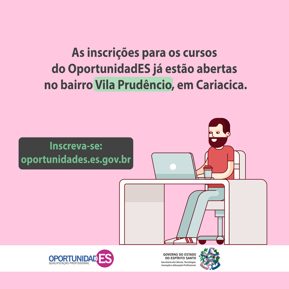 Os cariaciquenses que possuem mais de 16 anos e estão à procura de uma qualificação profissional já podem comemorar. Nesta terça-feira (26), o Projeto OportunidadES abriu 300 vagas para 10 opções de cursos presenciais gratuitos de diferentes áreas profissionais, destinadas aos moradores de Vila Prudêncio e região. As inscrições terminam no próximo domingo, dia 1º. Os interessados devem garantir uma vaga no site do projeto: www.oportunidades.es.gov.br.