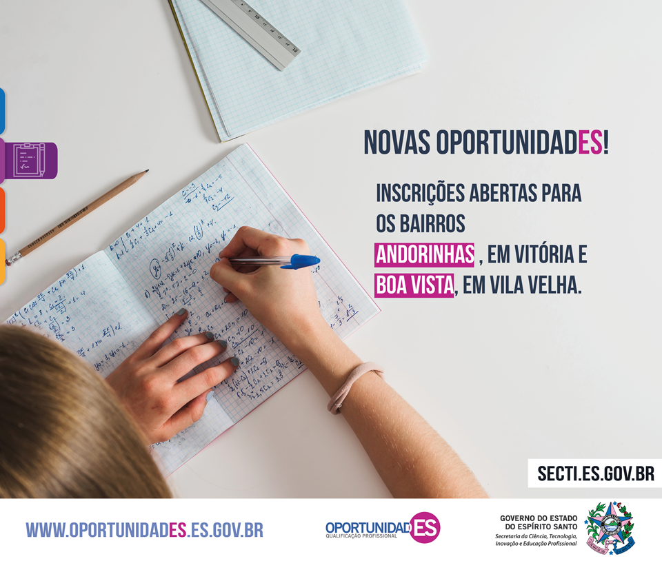 O Governo do Estado – por meio da Secretaria da Ciência, Tecnologia, Inovação e Educação Profissional (Secti) – abriu nesta terça-feira (03) as inscrições para os cursos de qualificação profissional gratuitos ofertados pelo projeto OportunidadES no bairro Andorinhas, em Vitória, e Boa Vista, em Vila Velha. Os interessados podem se inscrever pelo site ww.oportunidades.es.gov.br até o próximo domingo (08).