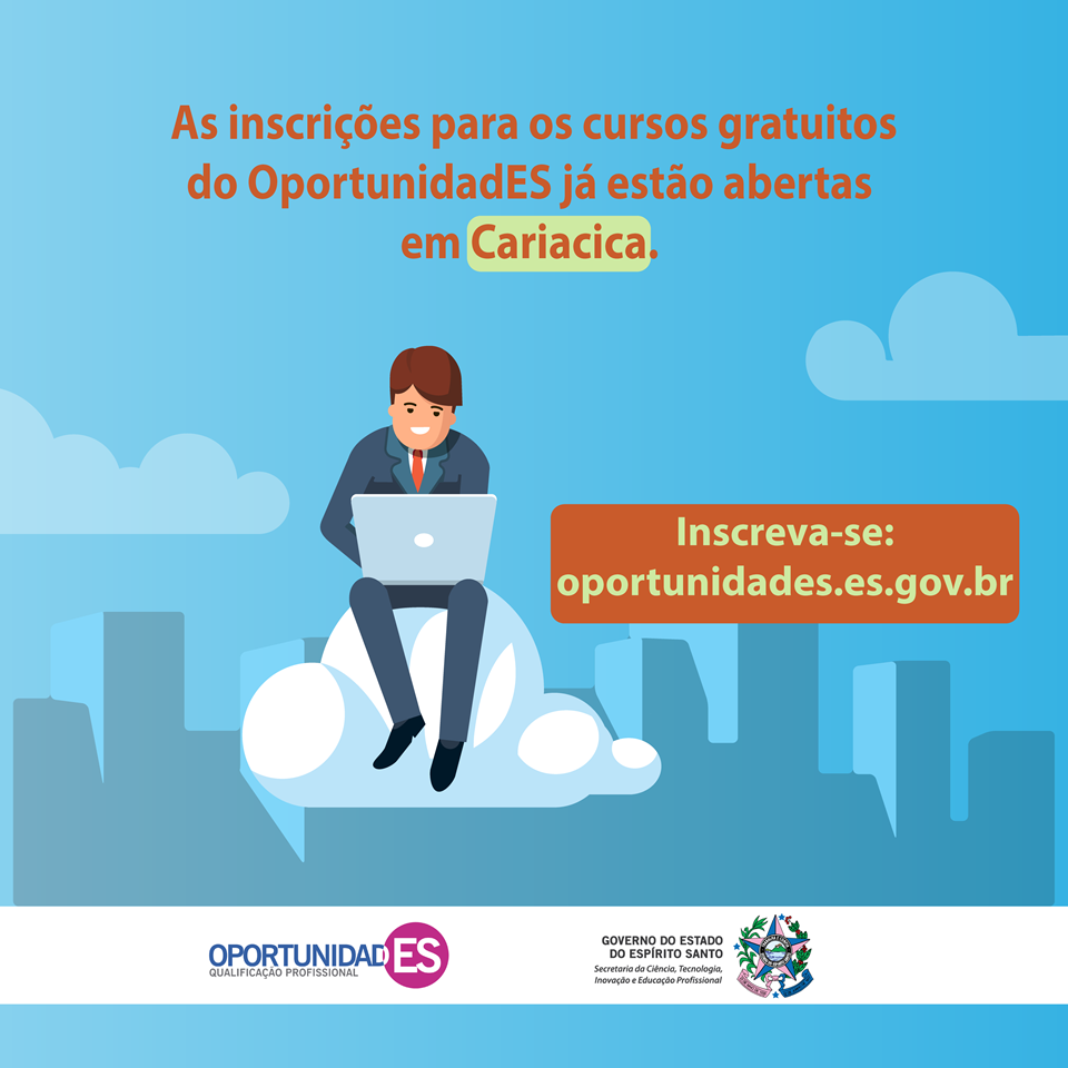 O período de inscrições começa nesta quinta (21) e termina no dia 1º de julho no site do projeto (www.oportunidades.es.gov.br). De acordo com o edital, para se inscrever o candidato deve residir em Cariacica e ter acima de16 anos, exceto nos cursos da área da saúde, em que o interessado deve ter mais de 18 anos. E só é permita uma inscrição por CPF. A seleção é por ordem de inscrição e o resultado será divulgado no dia 05 de julho no mesmo site.