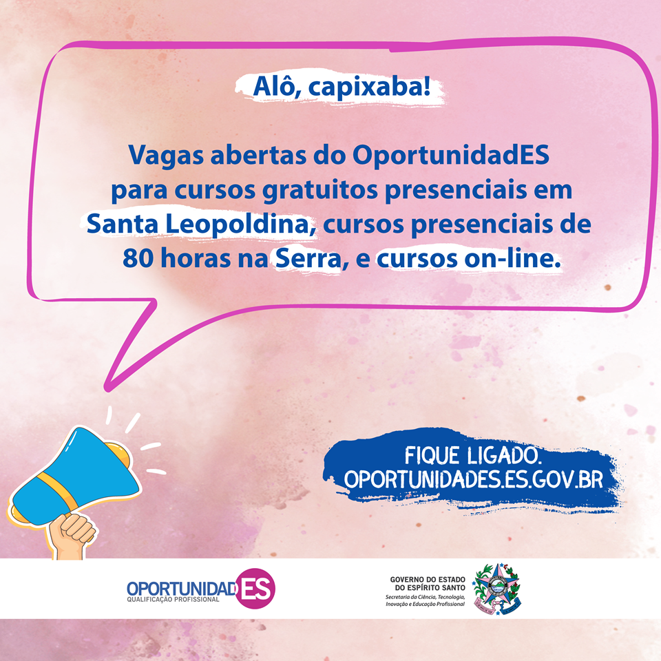 A partir desta semana, o capixaba do interior do Espírito Santo também será contemplado com os cursos de graça do Projeto OportunidadES. A secretaria de Estado da Ciência, Tecnologia, Inovação e Educação Profissional (Secti) ampliou o alcance do projeto e traz novidades: cursos presenciais de 40 horas em Santa Leopoldina; e cursos presenciais de 80 horas na Serra. Além de cursos on-line de 80 horas para todo o Estado e cursos presenciais de 40 horas em Viana.