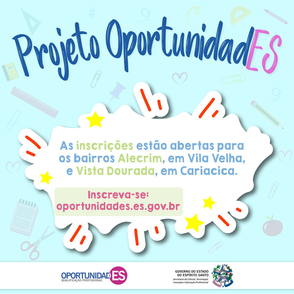 Se você mora em Vila Velha ou em Cariacica essa é a sua chance para aprender uma profissão de graça. O Projeto OportunidadES, realizado pela Secretaria de Estado da Ciência, Tecnologia, Inovação e Educação Profissional (Secti), está com 640 vagas em 22 opções de cursos presenciais.