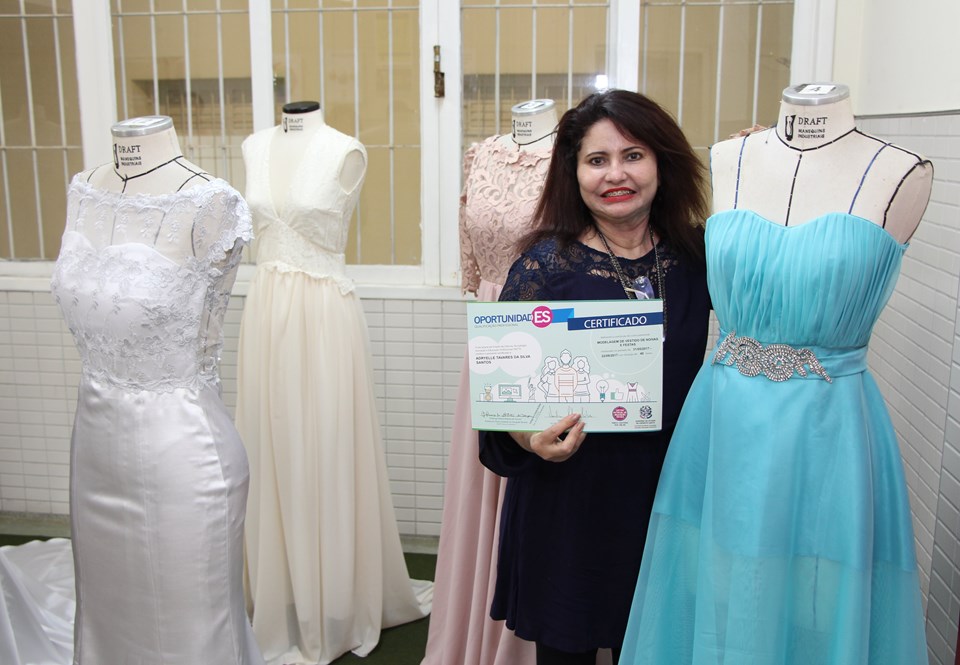 Noite de alegria para 278 estudantes do OportunidadES de Vila Velha. E um deles é a estilista Fátima Drago, de 53 anos. Moradora do bairro Ataíde, a formanda trabalha na área da moda há aproximadamente 20 anos. Se tornou profissional após um curso técnico no Centro Estadual de Educação Técnica (CEET) Vasco Coutinho. Ela decidiu fazer o curso do projeto de Modelagem de Vestido de Noivas e Festas para atualizar seu conhecimento.