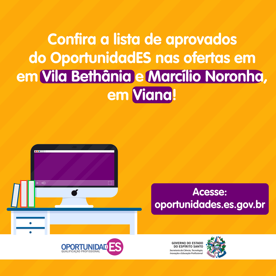O projeto OportunidadES tem um comunicado importante para os moradores de Marcilio de Noronha e Vila Bethânia, em Viana: a lista com os aprovados nas ofertas de cursos presenciais já está disponível. Para saber se você foi um dos selecionados, acesse o site do projeto (www.oportunidades.es.gov.br) ou click nos links abaixo: