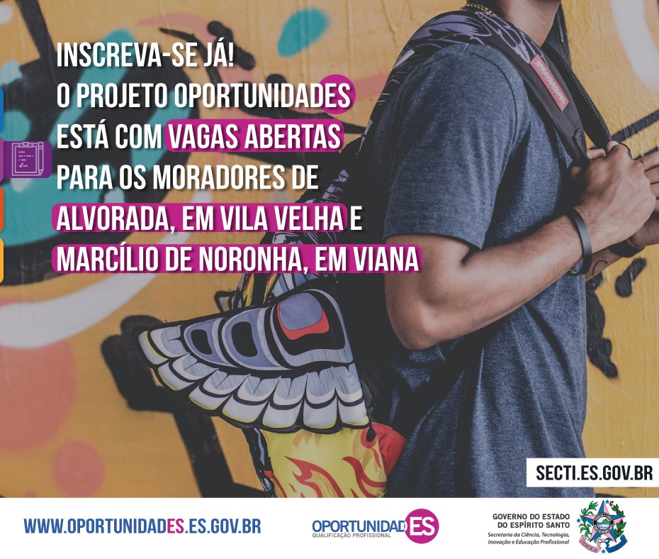 Mais capixabas terão a chance de fazer os cursos de qualificação profissional gratuitos do Projeto OportunidadES. Estão abertas, a partir desta terça-feira (31), 620 vagas para moradores do bairro Alvorada, no município de Vila Velha, e moradores do bairro Marcílio de Noronha, em Viana. As inscrições terminam no dia próximo domingo (05). Os interessados devem se inscrever pelo site www.oportunidades.es.gov.br para garantir a vaga.