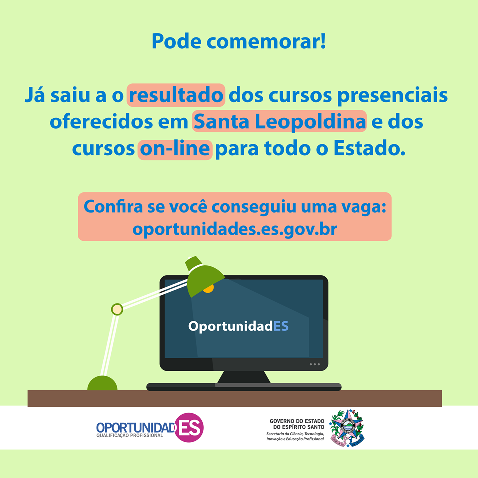 Trinta e oito cursos de qualificação profissional foram oferecidos gratuitamente aos capixabas pela Secretaria de Estado da Ciência, Tecnologia, Inovação e Educação Profissional (Secti), por meio do Projeto OportunidadES. As vagas 10.540 vagas foram destinadas aos moradores do bairro Santa Rita, em Vila Velha, de Santa Leopoldina e a todos os capixabas do Espírito Santo em cursos a distância.