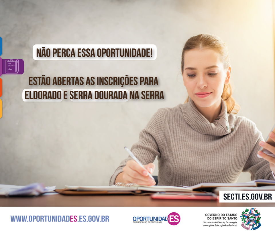 O projeto OportunidadES abriu mais vagas para os cidadãos de Serra. Dessa vez os beneficiados são os moradores dos bairros Eldorado e Serra Dourada II. As inscrições iniciaram nesta terça-feira (17) e terminam no domingo (22). Os interessados devem garantir suas vagas no site www.oportunidades.es.gov.br preenchendo corretamente o formulário de inscrição.