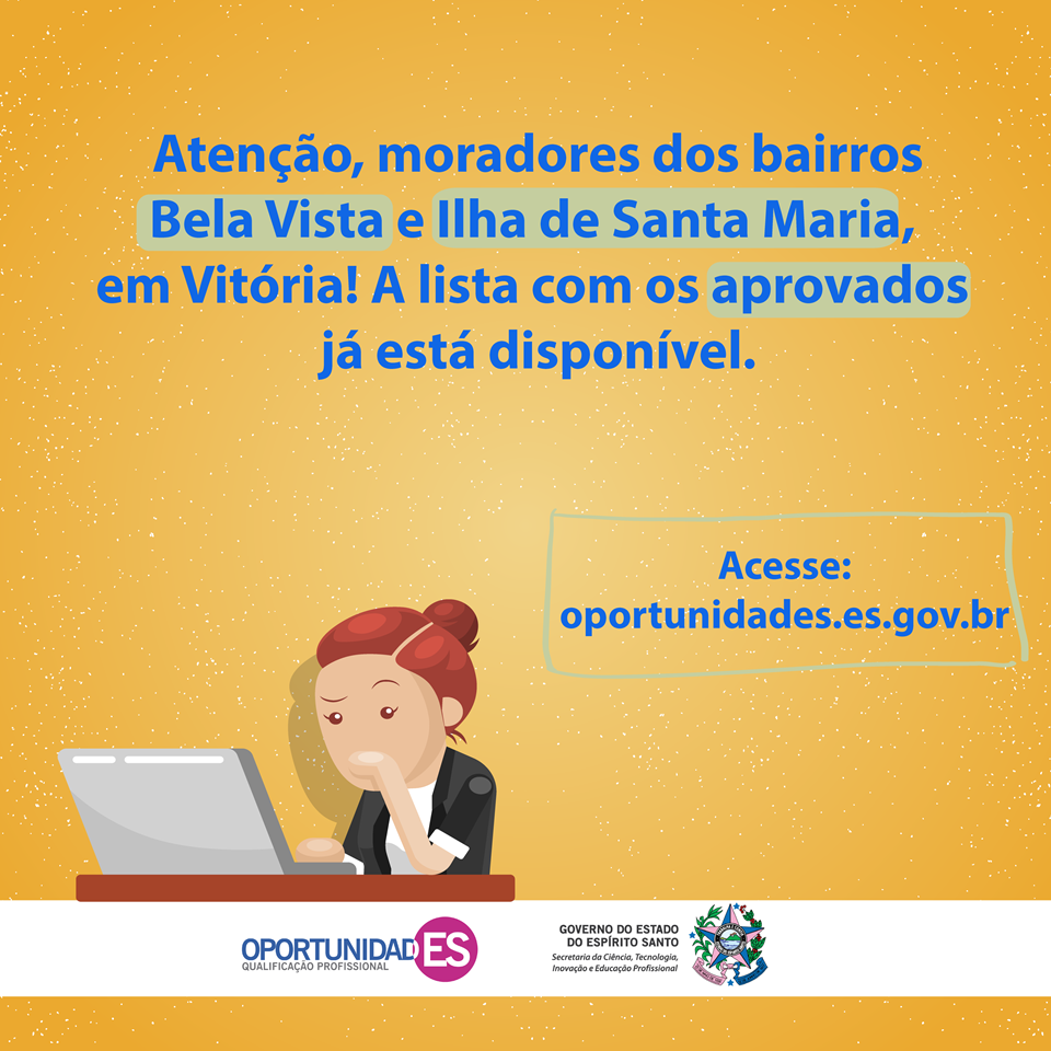 Os moradores de Bela Vista e Ilha de Santa Maria, em Vitória, já podem comemorar. A lista com os classificados e suplentes nas ofertas que contemplaram os dois bairros estão disponíveis no site do projeto OportunidadES (www.oportunidades.es.goc.br). Quem preferir, pode clicar nos links abaixo e conferir os nomes dos selecionados: