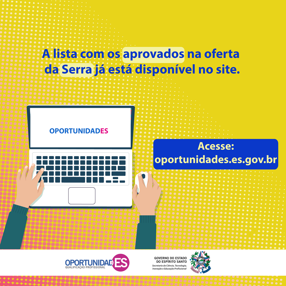 O Projeto OportunidadES, desenvolvido pelo Governo do Estado - por meio da Secretaria da Ciência, Tecnologia, Inovação e Educação Profissional (Secti) - traz ótima notícia aos serranos: a lista com os aprovados na terceira oferta de cursos gratuitos já está disponível no site www.oportunidades.es.gov.br.