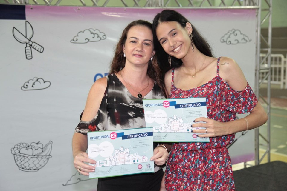 “Me formei como auxiliar de rotinas administrativas. Escolhi esse curso porque tem muitas ofertas no mercado. Já me formei no ensino médio e vi uma ótima chance de me profissionalizar, arrumar um emprego e conseguir uma renda para ajudar os meus pais. As aulas foram maravilhosas, os professores são dedicados e sempre tiram as nossas dúvidas. Achei o OportunidadES tão bom que já estou fazendo o curso de Maquiagem Básica e Design de Sobrancelhas. E minha mãe também participou do projeto e formou hoje,” contou Maria Eduarda.
