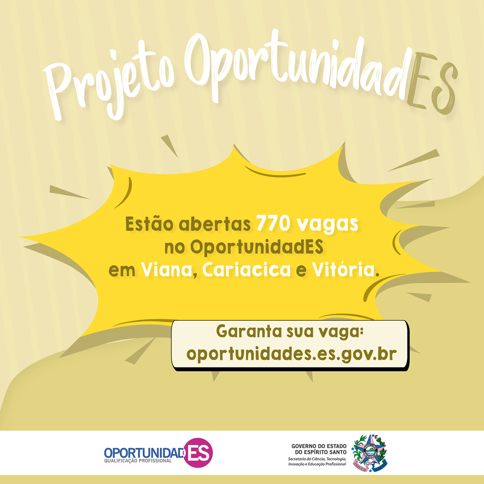 A Secretaria de Estado da Ciência, Tecnologia, Inovação e Educação profissional (Secti) abriu nesta semana, por meio do Projeto OportunidadES, 770 vagas em 30 opções de cursos de qualificação de graça para os capixabas. Os contemplados são os moradores de Viana, Cariacica e Vitória que possuem mais de 16 anos.