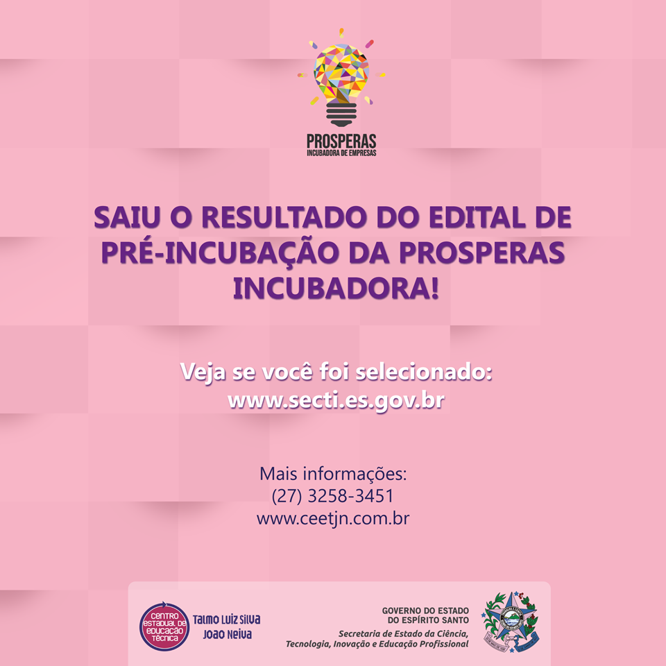 A Secretaria de Estado da Ciência, Tecnologia, Inovação e Educação Profissional (Secti) divulgou, nesta terça-feira (20), o resultado do Edital de Pré-Incubação de Novos Empreendimentos – Modalidade Competências Empreendedoras – da Prosperas Incubadora, que visa atender os empreendedores da região norte do Espírito Santo, com foco no município de João Neiva. A Prosperas Incubadora é uma iniciativa do Centro Estadual de Educação Técnica (CEET) Talmo Luiz Silva.