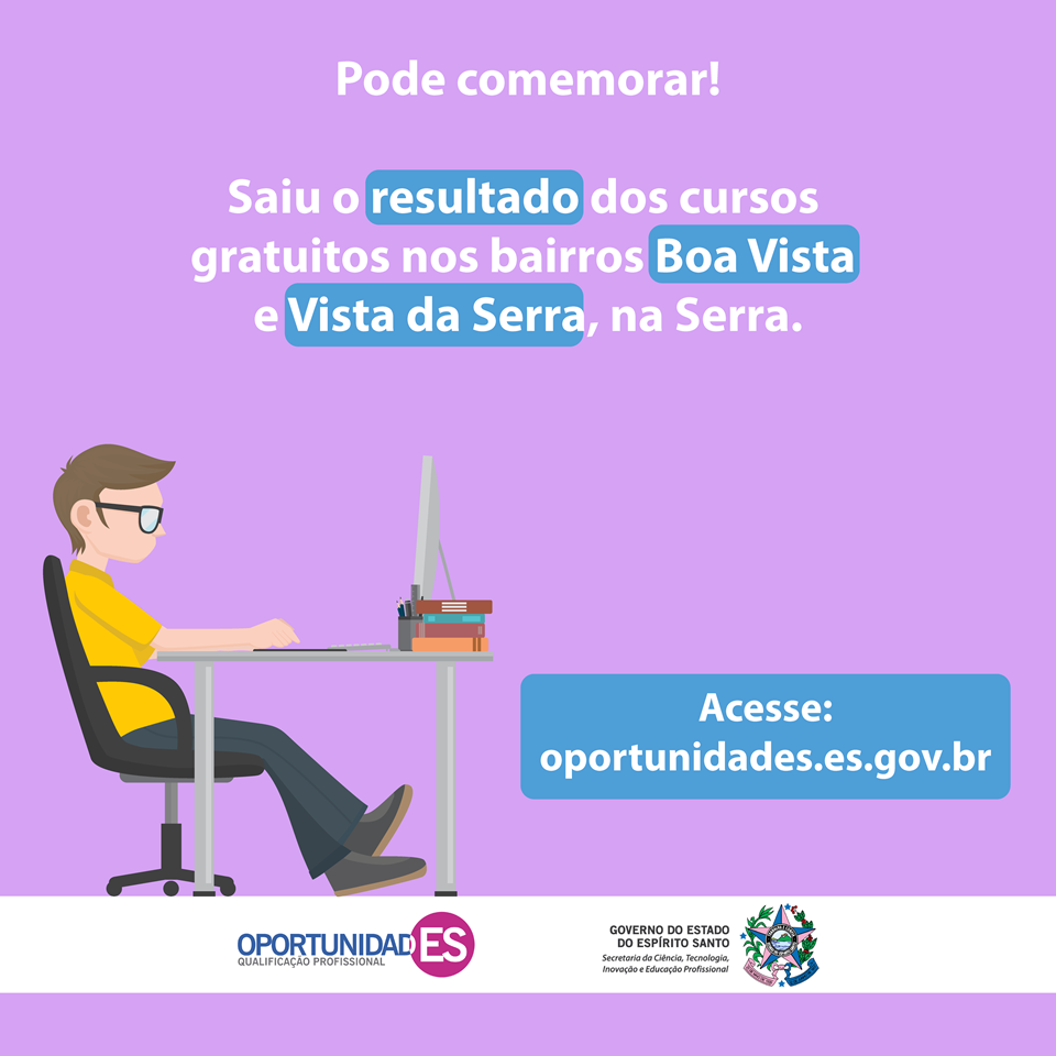 Os 1.414 serranos que se inscreveram nos cursos gratuitos do OportunidadES já podem conferir a lista dos aprovados nos bairros Boa Vista e Vista da Serra, na Serra. Basta acessar o site do projeto (www.oportunidades.es.gov.br) ou clicar nos links abaixo: