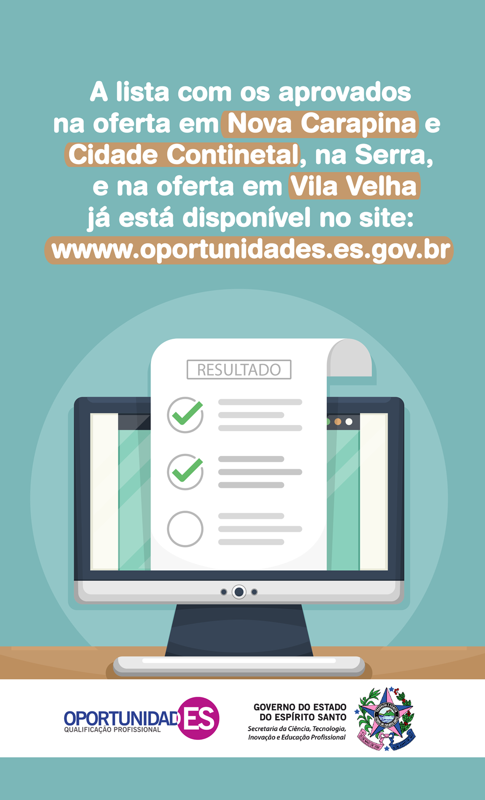 O OportunidadES divulgou a lista com os aprovados nas ofertas de cursos gratuitos para os bairros Cidade Continental e Nova Carapina, na Serra, e na oferta que contemplou todos os moradores de Vila Velha. A lista pode ser acessada no site www.oportunidades.es.gov.br, ou nos links abaixo: