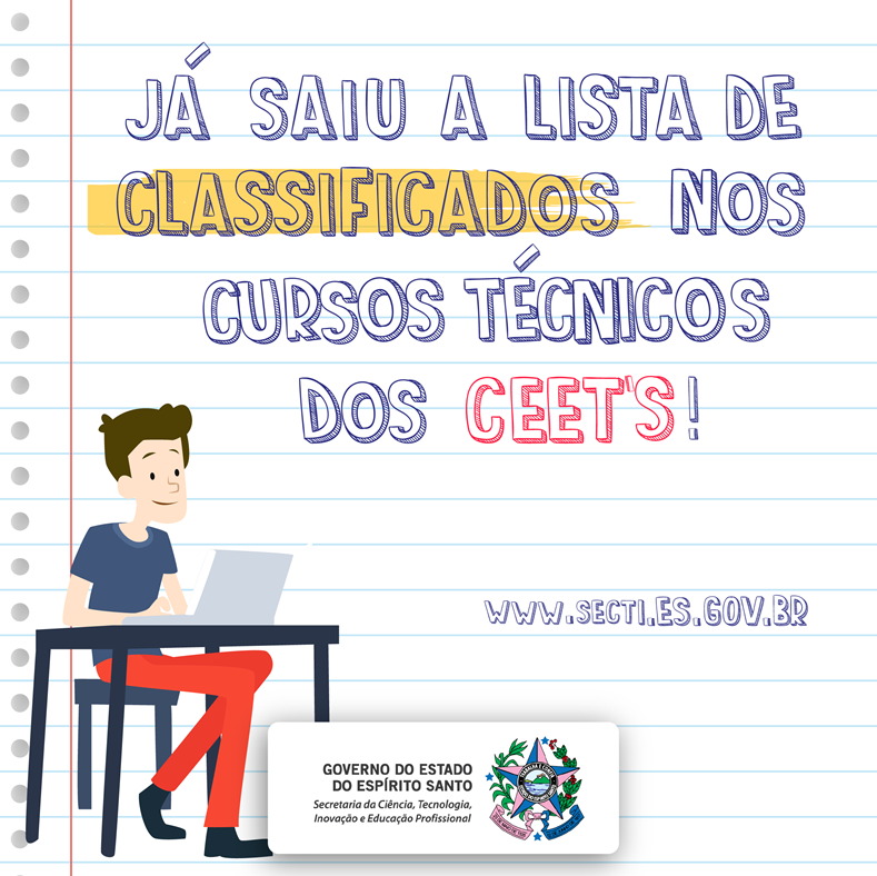 A ansiedade acabou para os 5.427 capixabas que se inscreveram em um dos cursos técnicos gratuitos do Governo do Estado. Já estão disponíveis as listas de classificados nos Centro Estaduais de Educação Técnica Vasco Coutinho, em Vila Velha, e Talmo Luiz Silva, em João Neiva. Os nomes dos classificados e suplente estão disponíveis no site da Secretaria de Estado da Ciência, Tecnologia, Inovação e Educação Profissional (Secti) (www.secti.es.gov.br), na aba Editais, ou no link abaixo.