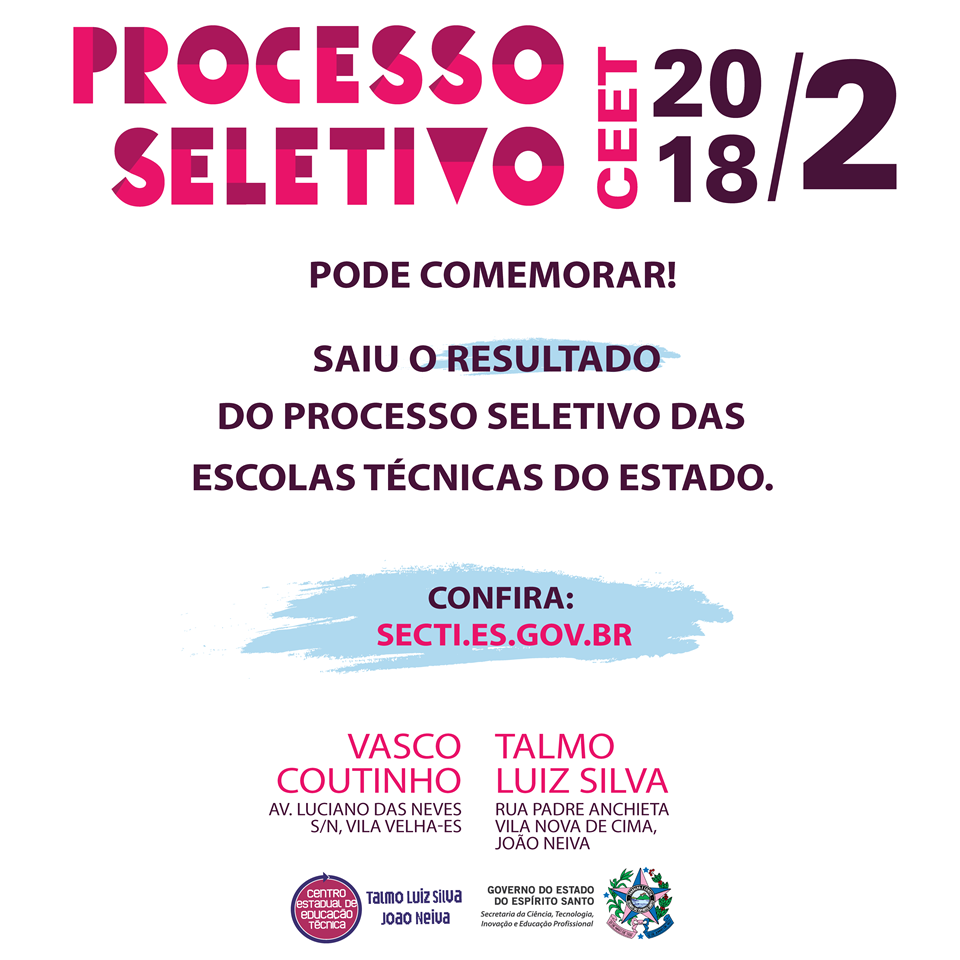 No CEET Vasco Coutinho, os suplentes – além de seguir o prazo de matrícula – devem respeitar o calendário de datas de acordo com a sua classificação na lista de aprovados. O cronograma pode ser acessado no site “Seleção Aluno” (www.selecaoaluno.es.gov.br) ou clicando aqui.