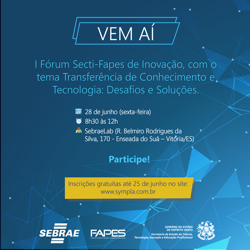 A Secretaria de Estado da Ciência, Tecnologia, Inovação e Educação Profissional (Secti) promove o 1º Fórum Secti-Fapes de Inovação. O evento tem como tema “Transferência de Conhecimento e Tecnologia: Desafios e Soluções” e acontece no dia 28 de junho no SebraeLab, na Enseada do Suá, em Vitória.