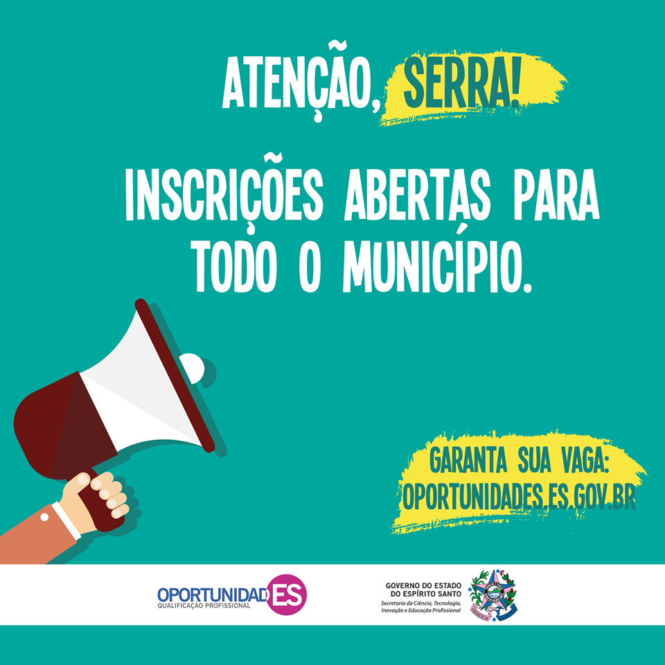 Atenção, Serranos! O projeto OportunidadES está com mais 500 vagas abertas em cursos de qualificação profissional gratuitos na cidade. O morador da Serra que possui mais de 16 anos e deseja se qualificar, essa é a chance. O prazo para se inscrever é até o próximo dia 29 e essa é a terceira vez que o projeto beneficia todos os moradores do município.